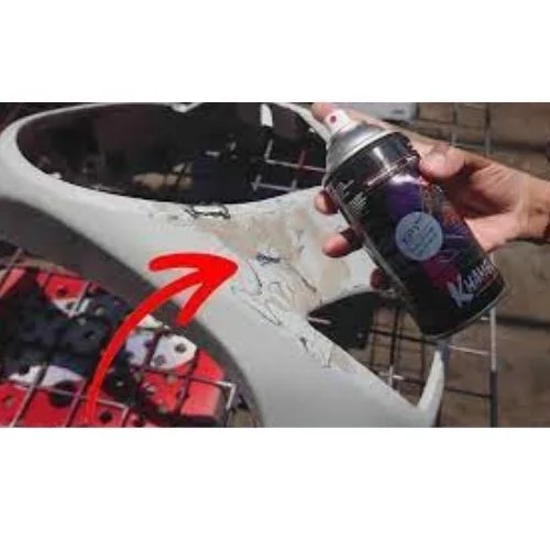 Chà nhám chỗ trầy xướt cho thật mịn, sau đó xịt lớp bột bả matit KP1 lên và chờ khô 30-45p rồi sử dụng sơn lót 2k4 hoặc Uch210 để lót lại bề mặt.