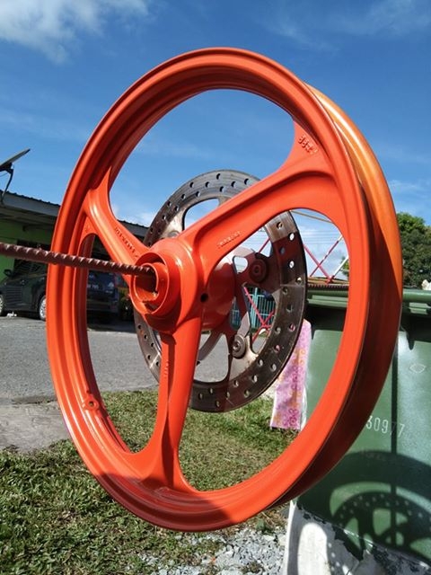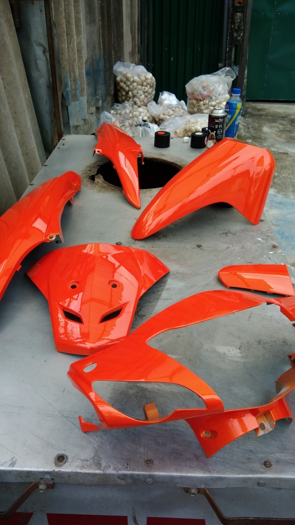 Bước 5: Sơn 2-3 lớp mỏng màu cam rực Y3505*, mỗi lớp cách nhau 3-5 phút (hoặc lâu hơn tùy vào điều kiện thời tiết)