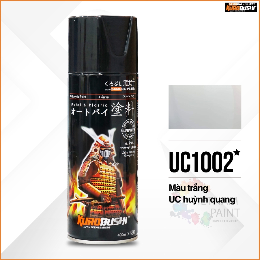 Chai sơn samurai màu trắng huỳnh quang Uc1002 400ml có thể sử dùng để làm màu chính (trắng sáng huỳnh quang) hoặc dùng làm màu nền cho các màu huỳnh quang khác như vàng chanh, xanh lá, cam, hồng...